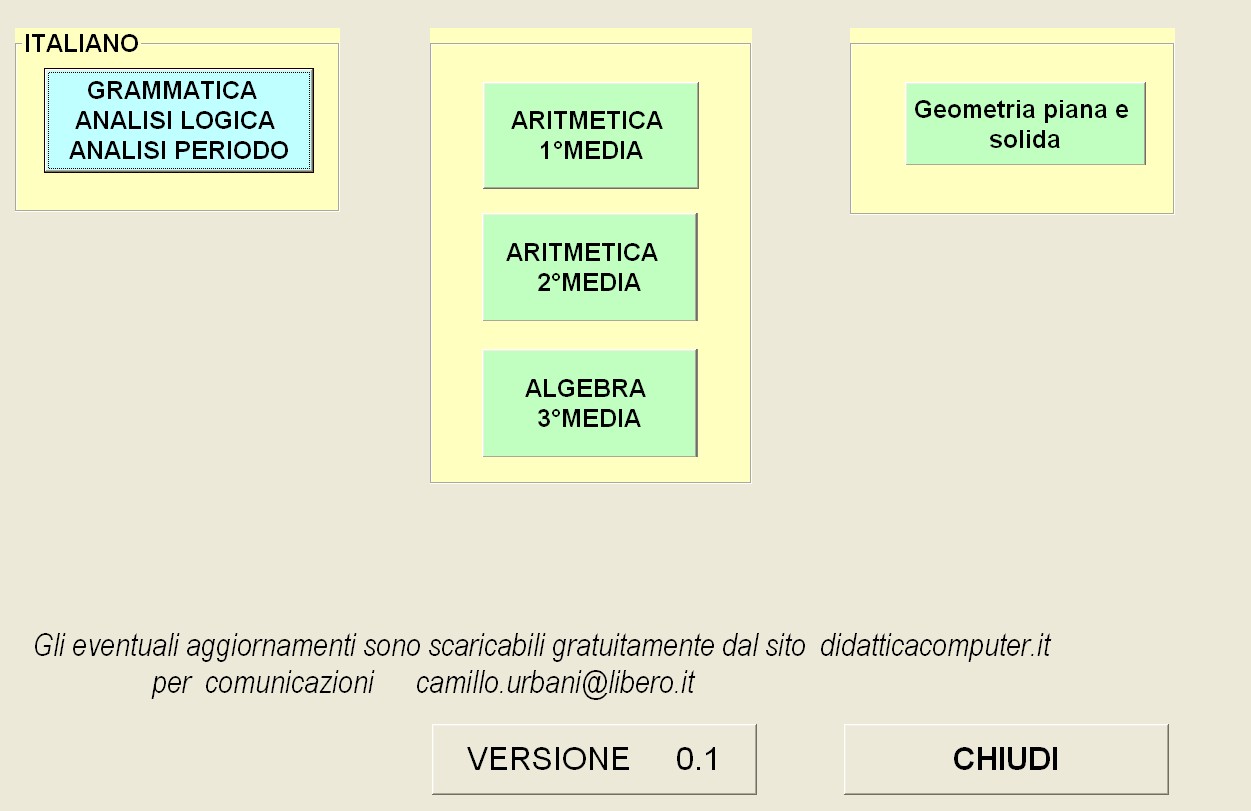 serve per scaricare sul proprio PC l’applicativo “Didattica Al Computer (v0.1)” con esercizi di Italiano e Matematica (e Geometria) di modeste dimensioni: 7,3 MB. Avviandolo, cliccando due volte sul file start, riporta una serie di esercizi didattici di italiano e matematica per i tre anni delle medie.